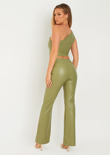 Sexy and stylish in our Marlowe Green Folder Over Faux Leather Flare Trouser, with a folded waistband and flared fit, this will look so coo styled with the matching top.