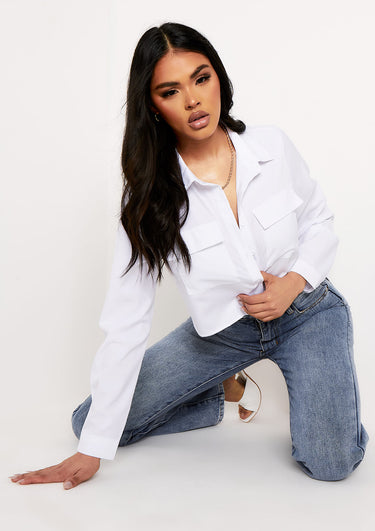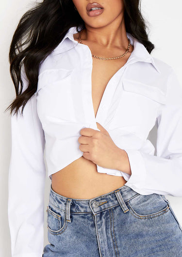 Add a chic touch to your look with this shirt doll. Our Dulci White Pocket Front Crop Shirt features a white