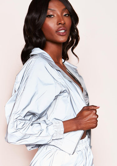 Oh its a vibe!! Our Edi Silver Reflective Cropped Jacket features high neck, long sleeves, cropped fit and elasticated waist.