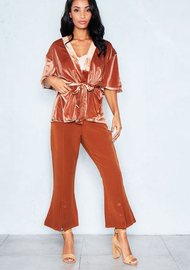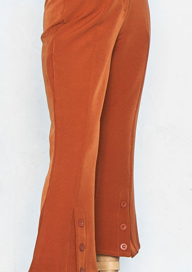 Make a serious style statement and stand out from the crowd in these bold and beaut Lupita Rust Split Front Flare Trousers. Featuring A culotte style, button detail at from finished with a front slit at hem.