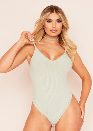 Sage Ribbed Strappy Plunge Bodysuit