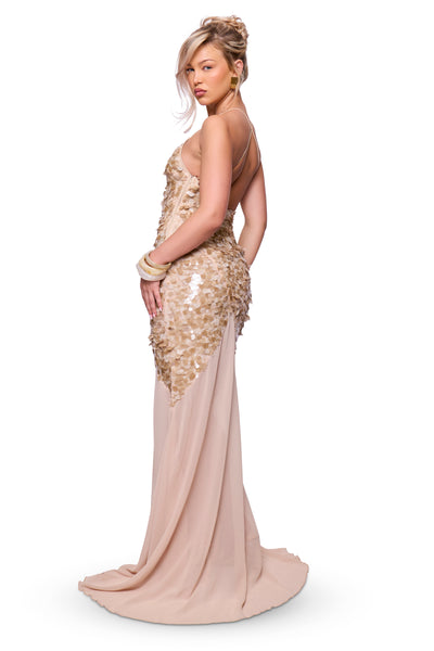 This sequin maxi dress is heavily embellished. Halter neck straps and a fitted sequin bodice give way to a flowing chiffon maxi skirt that feels light and effortless. Prepare to make an unforgettable entrance at your next black tie event or wedding.